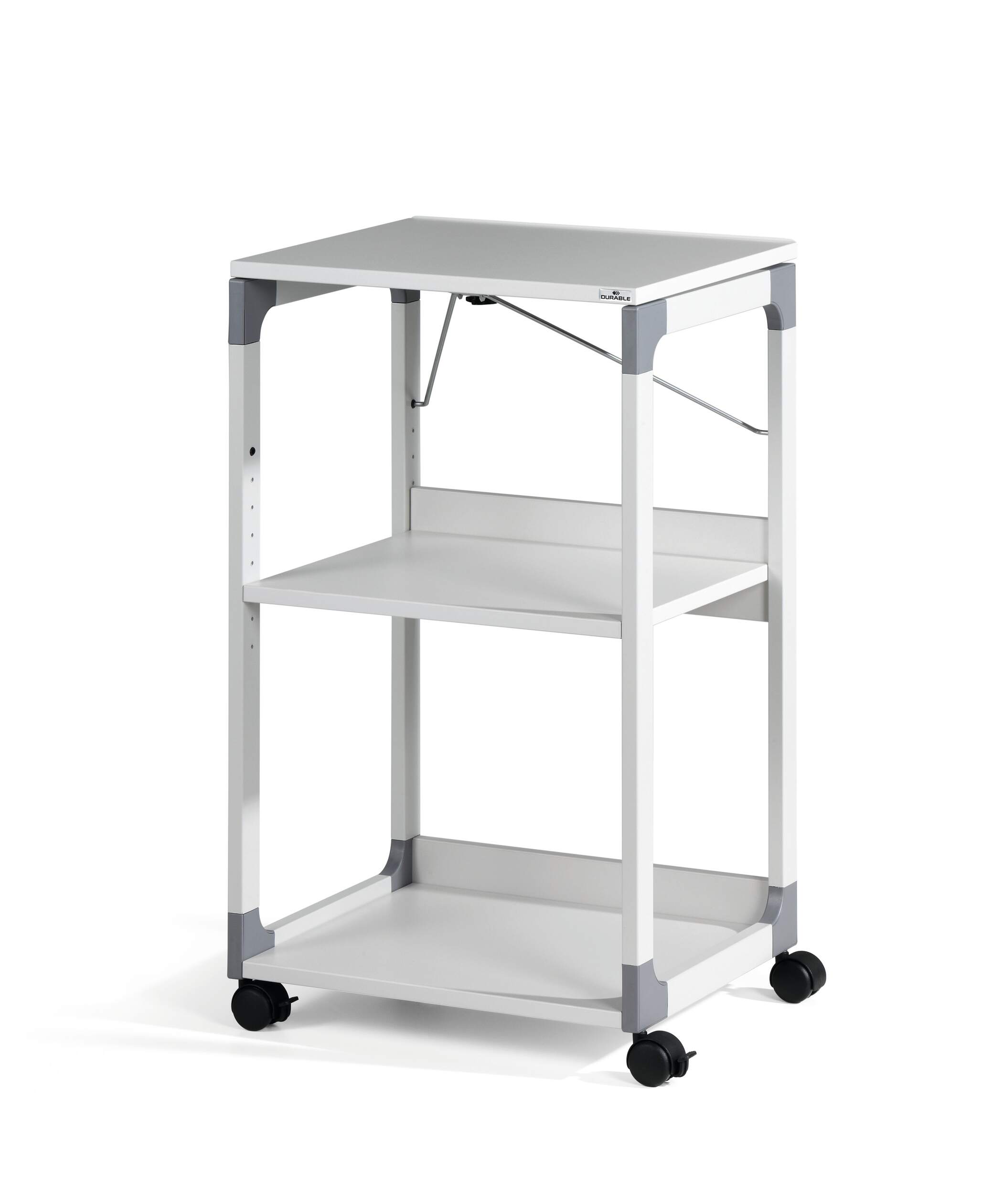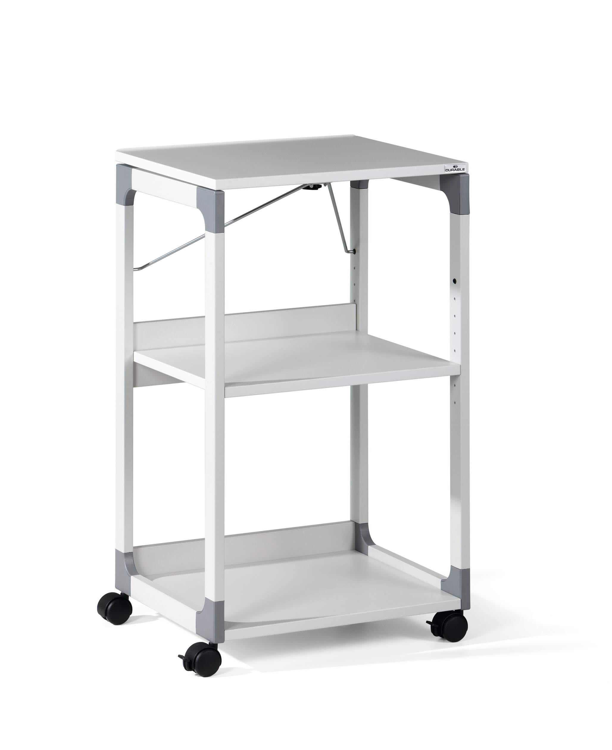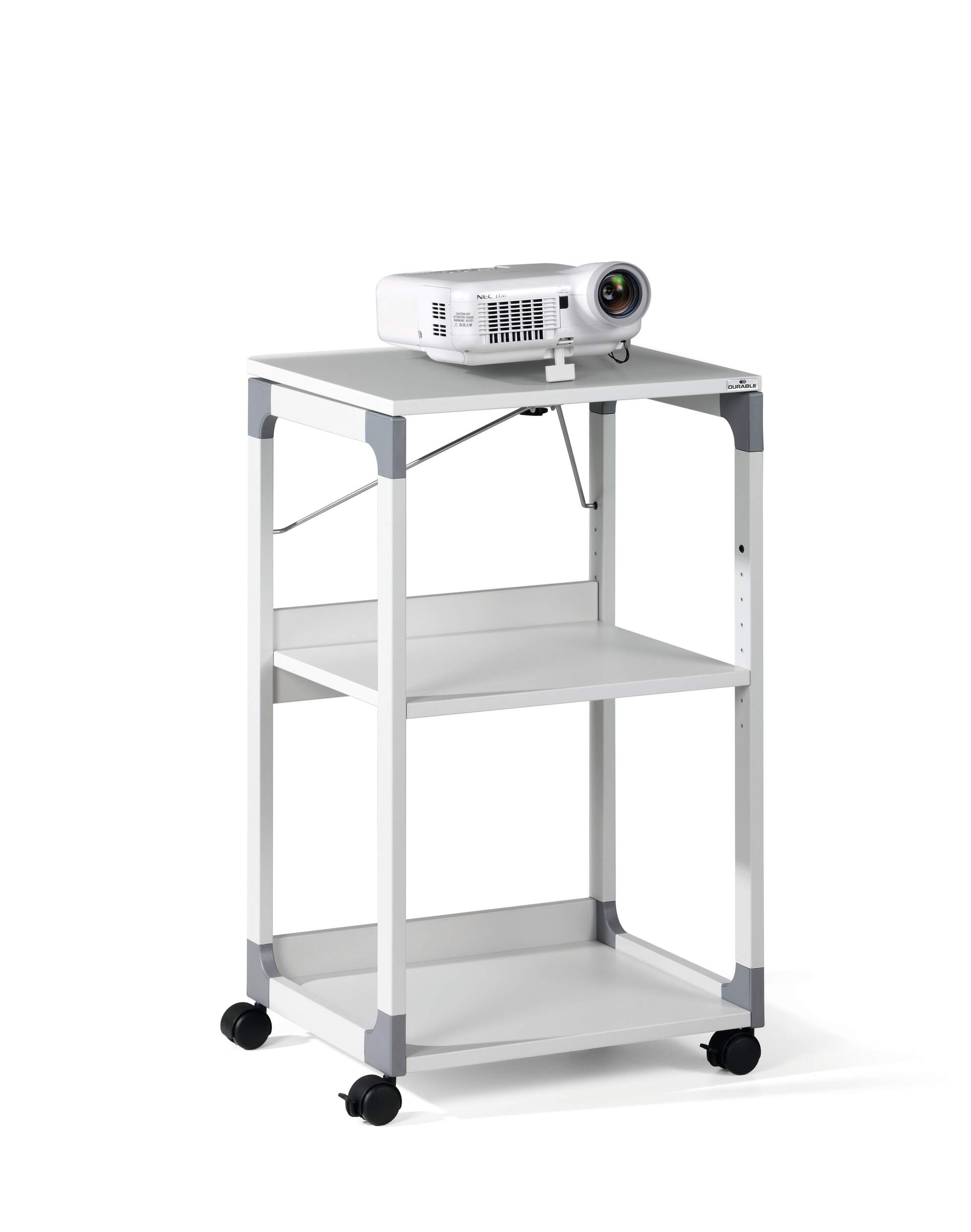 Projektorbord på hjul för en projektor / beamer eller overhead. Slitstarka hyllor av 19 mm träskivor där översta hyllan har justerbar lutningsvinkel föratt få rätt position på projektorn. Den går också att fälla ut i sidled för att ge plats för en overheadprojektor. Mittenhyllan är justerbar i 32 mm intervaller. Metallstomme med reptålig polyesterbeläggning och fiberglasförstärkta plasthörnor. 4 st svängbara länkhjul, varav 2 st har broms. Lätt att förflytta och stabil när den är “parkerad”. Levereras i platt paket med monteringsanvisningar. Mått översta hyllan: 508 x 432 mm (BxD). Mått mittenhyllan: 468 x 413 mm (BxD). Mått bottenhyllan: 468 x 413 mm (BxD).Totala mått: 882 x 508 x 432 mm (HxBxD)
