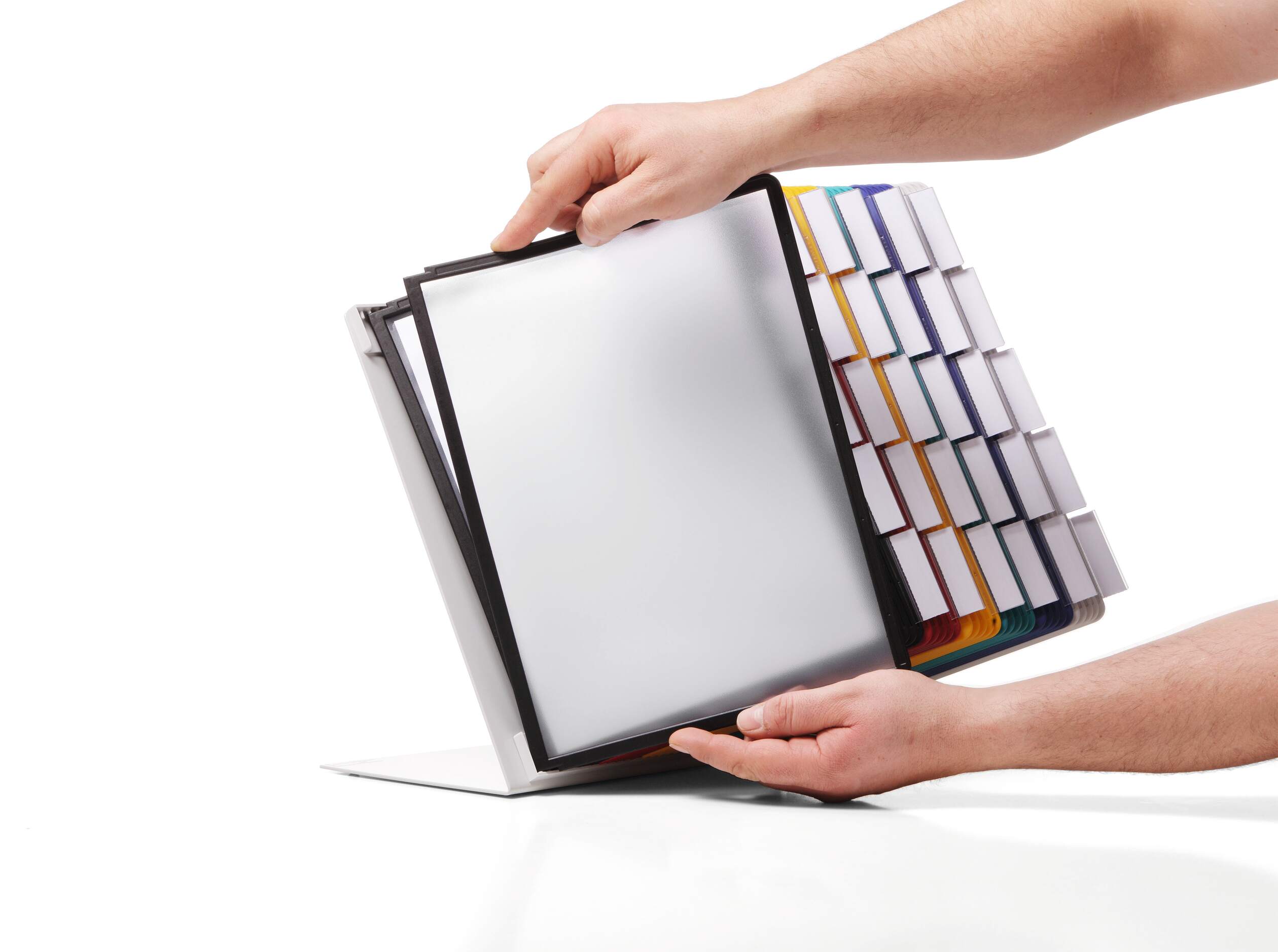 VARIO® TABLE är ett komplett bordställ med 30 st reflexfria, skanningsbara plastfickor (svarta, röda, gula, gröna, blå och grå) av polypropylen för dokument i A4-format. Flyttbara 58 mm rubrikhållare ingår. Vid insättning och borttagning av fickorna är det bra att böja fickan lite försiktigt i mitten längs med inre långsidan så går det lätt att sätta dit och ta bort fickan utan att piggarna i hållaren skadas. Gummitassar gör att den står stadigt. 5 års garanti. Garantivillkoren finns här: https://www.durable.se/sv_SE/service/garanti/garanti-foer-sherpa-vario/