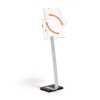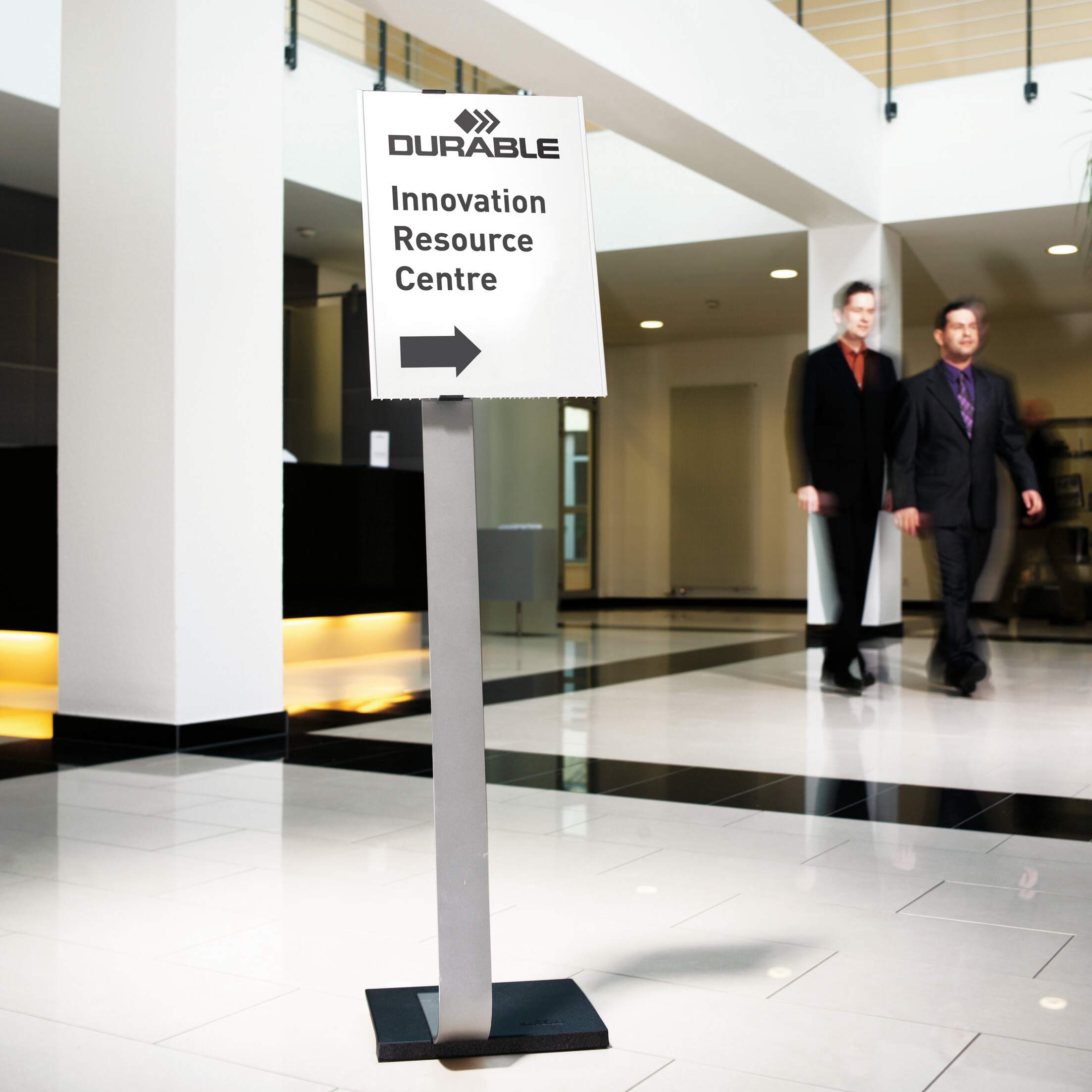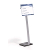 Golvskyltar informerar och orienterar besökare och passar utmärkt för placering i entreer, restauranger, utställningar m fl ställen. Skyltserien INFO SIGN har en baksida och kantlister av aluminium. Det vita arket med text sitter skyddat bakom den reflexfria frontskivan som skjuts ner i kantlisterna och hålls på plats av två svarta fästen. Golvstället består av en tung och stadig fot , ett stativ av aluminium och den vridbara A3 skylten – som kan användas stående eller liggande – syns på långt håll. Skylten ka n placeras på 6 olika höjder och ställets höjd med stående skylt är mellan 1.18 – 1.25 m. Med liggande skylt är höjden 1.13 – 1.20 m. Levereras med monteringsanvisning. Designa skylten med hjälp av gratisprogrammet DURAPRINT® som finns på www.duraprint.se och skriv ut med laserskrivare.