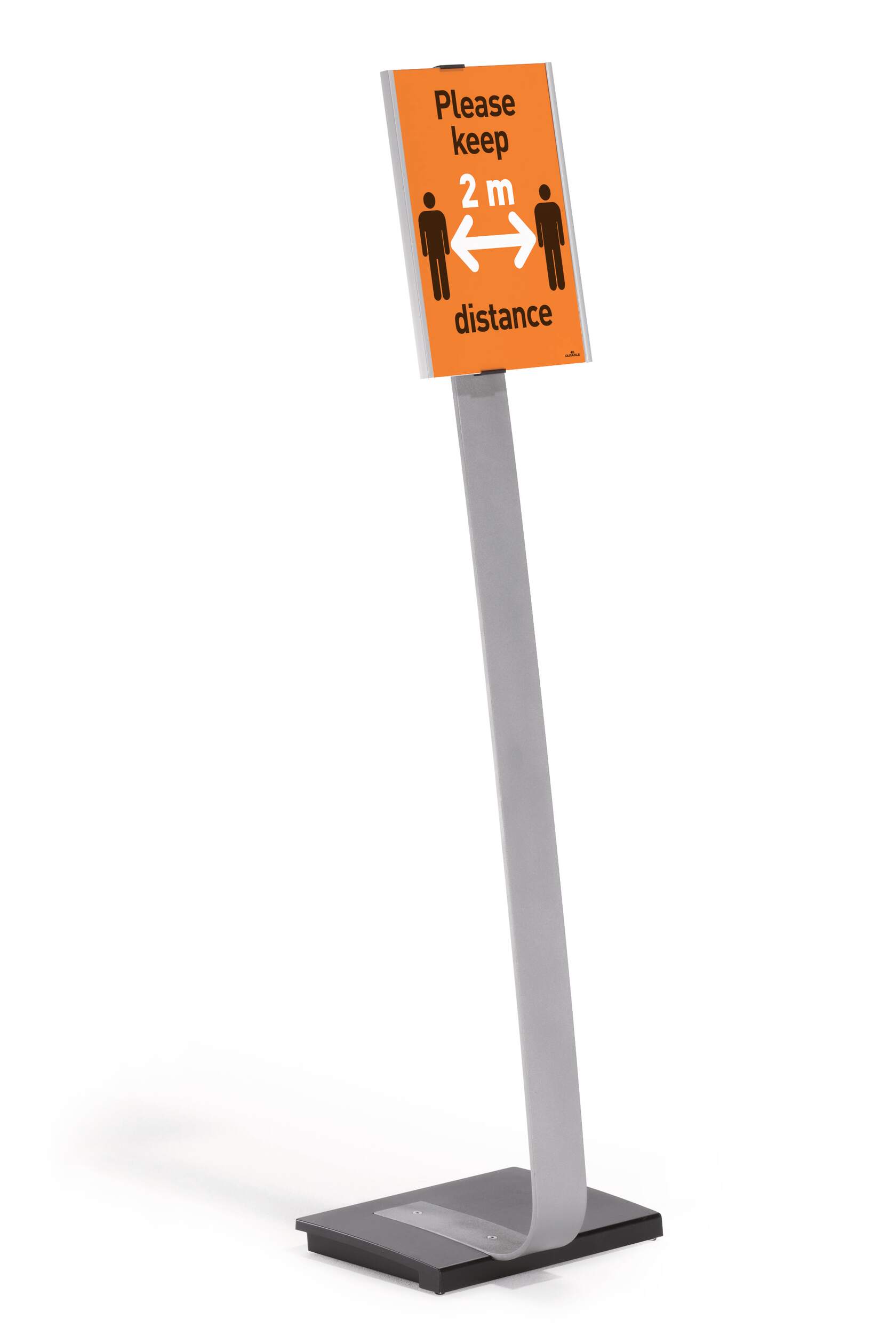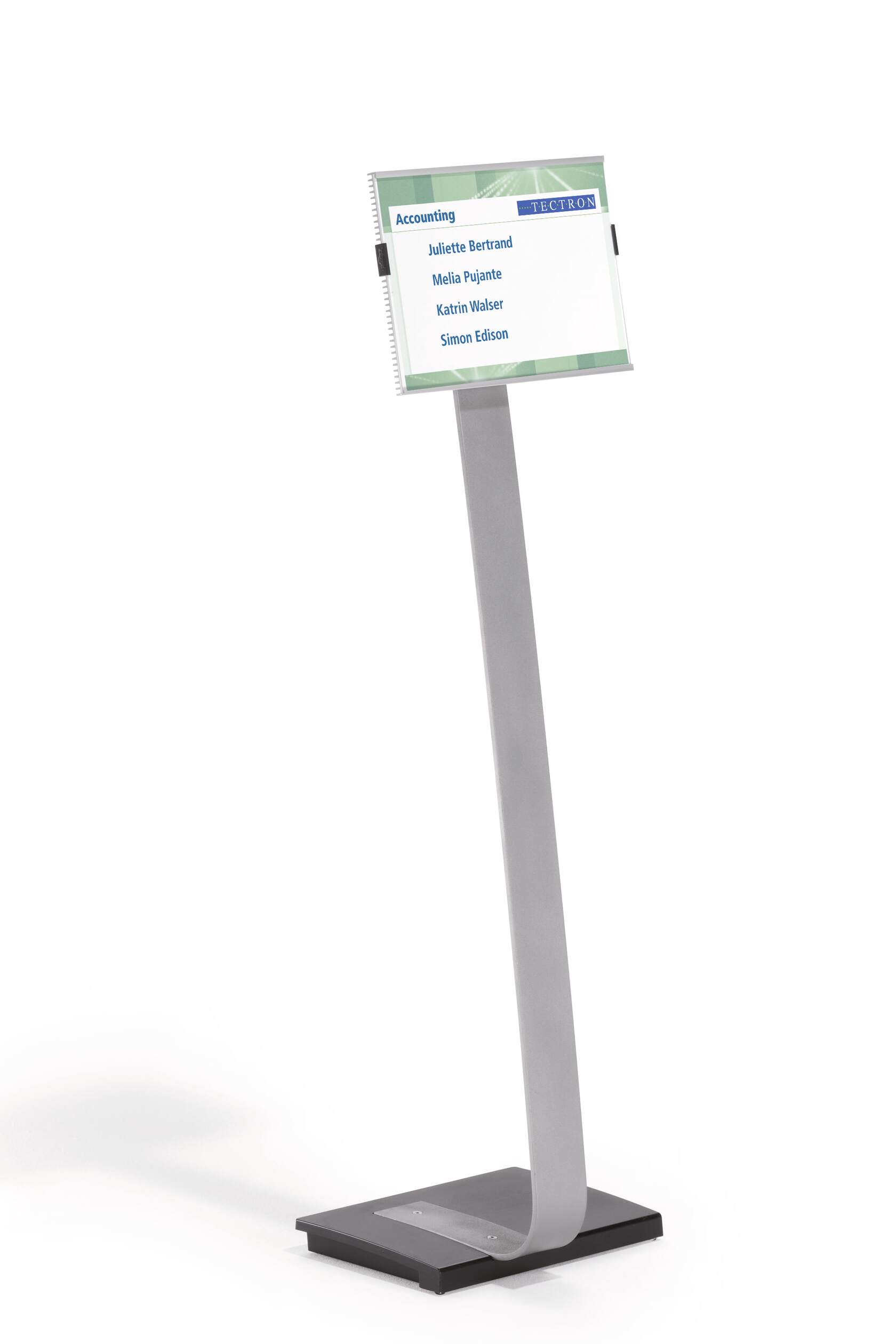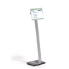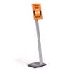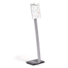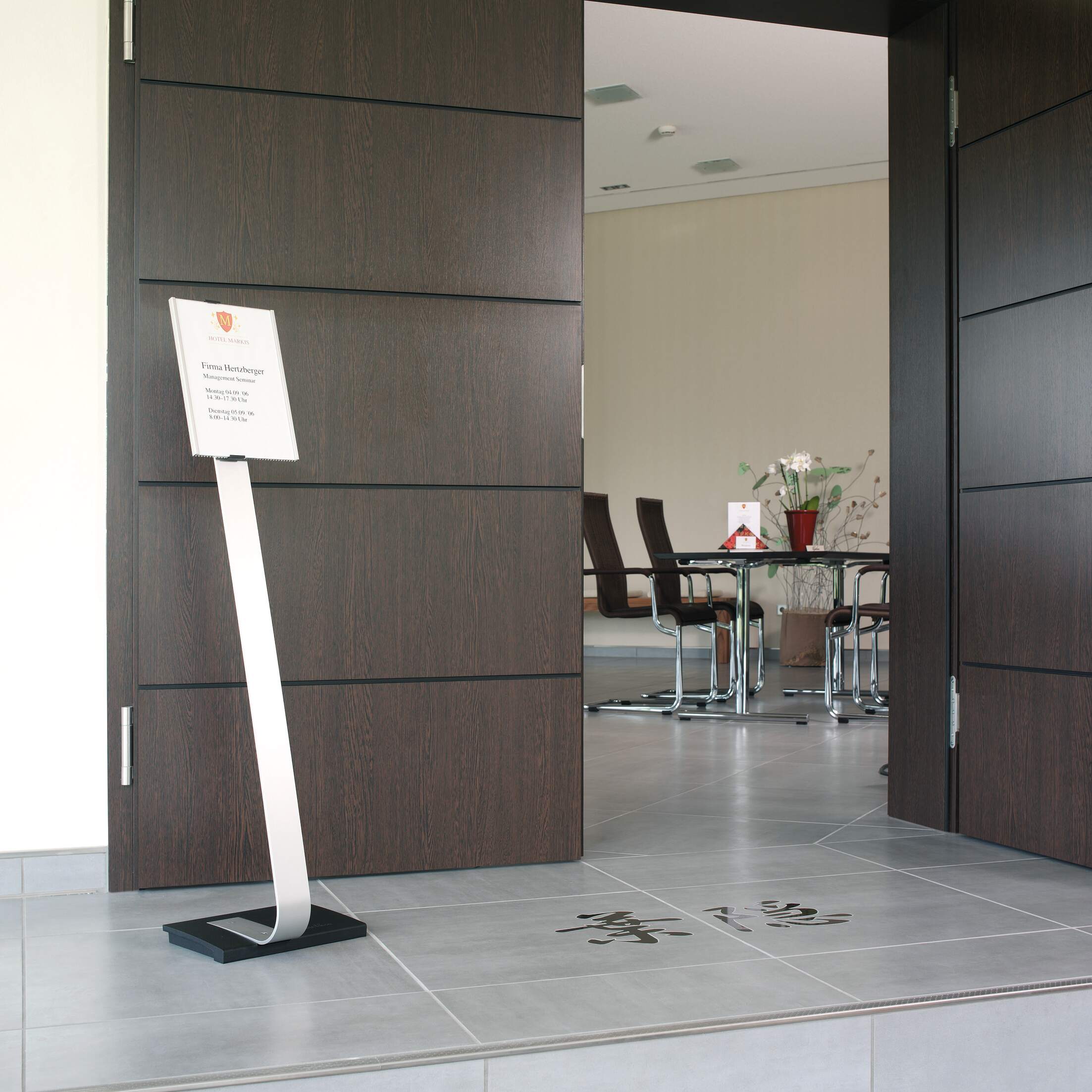 Golvskyltar informerar och orienterar besökare och passar utmärkt för placering i entreer, restauranger, utställningar m fl ställen. Skyltserien INFO SIGN har en baksida och kantlister av aluminium. Det vita arket med text sitter skyddat bakom den reflexfria frontskivan som skjuts ner i kantlisterna och hålls på plats av två svarta fästen. Golvstället består av en tung och stadig fot , ett stativ av aluminium och den vridbara skylten för material i A4 liggande eller stående format. Skylten kan placeras på 6 olika höjder och ställets höjd med stående skylt är mellan 1.11 – 1.18 m. Med liggande skylt är höjden 1.06 – 1.13 m. Levereras med monteringsanvisning.