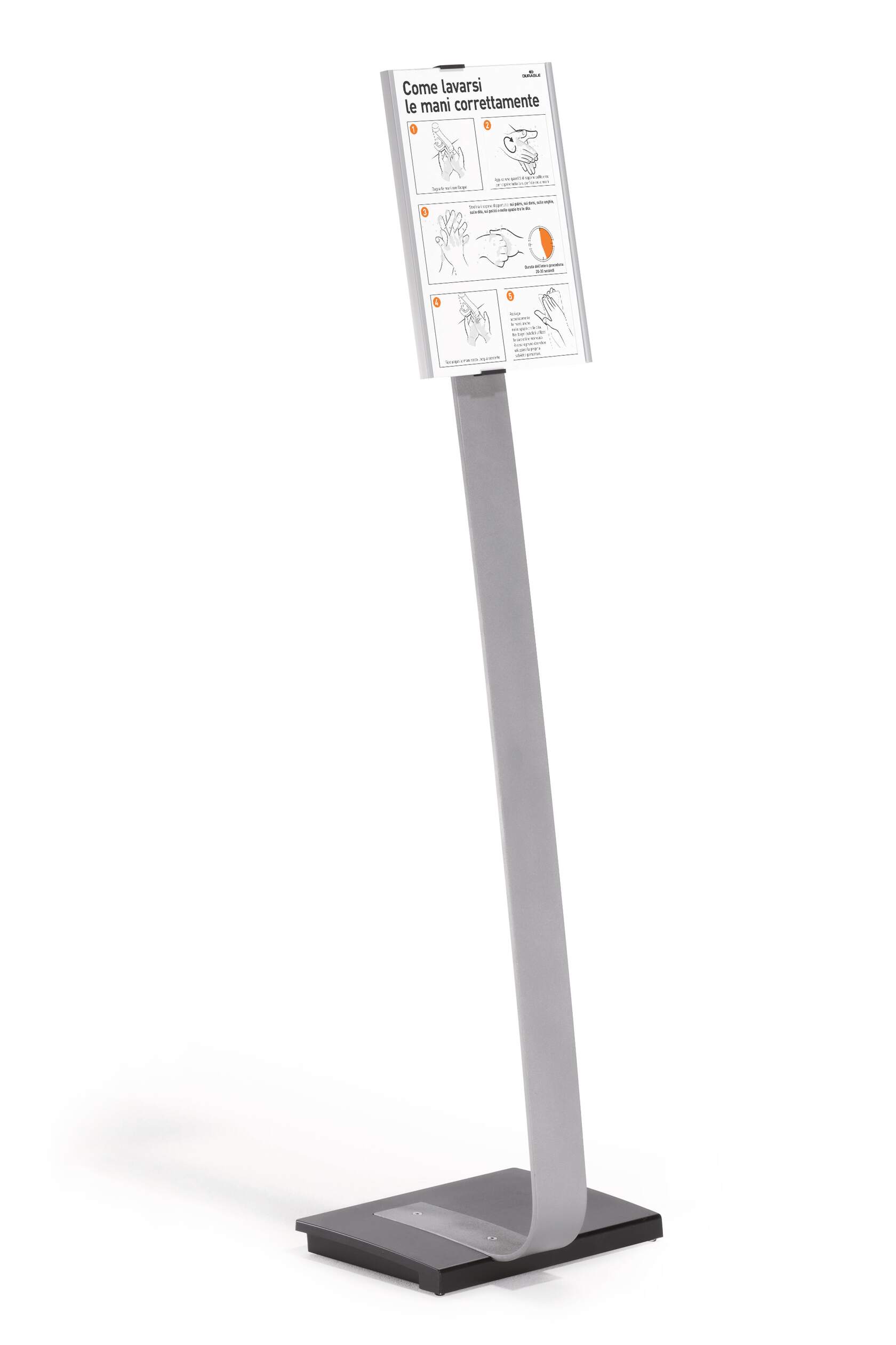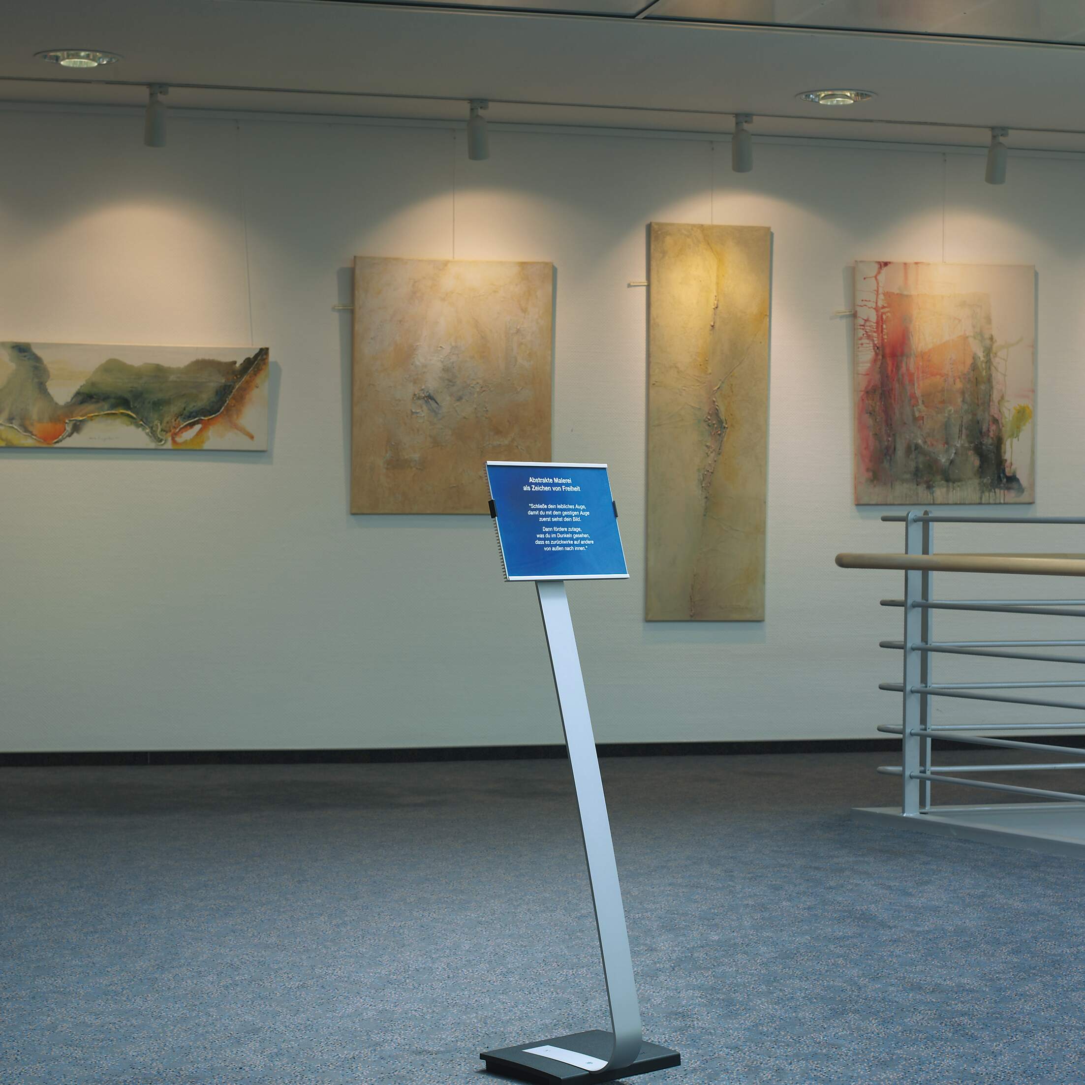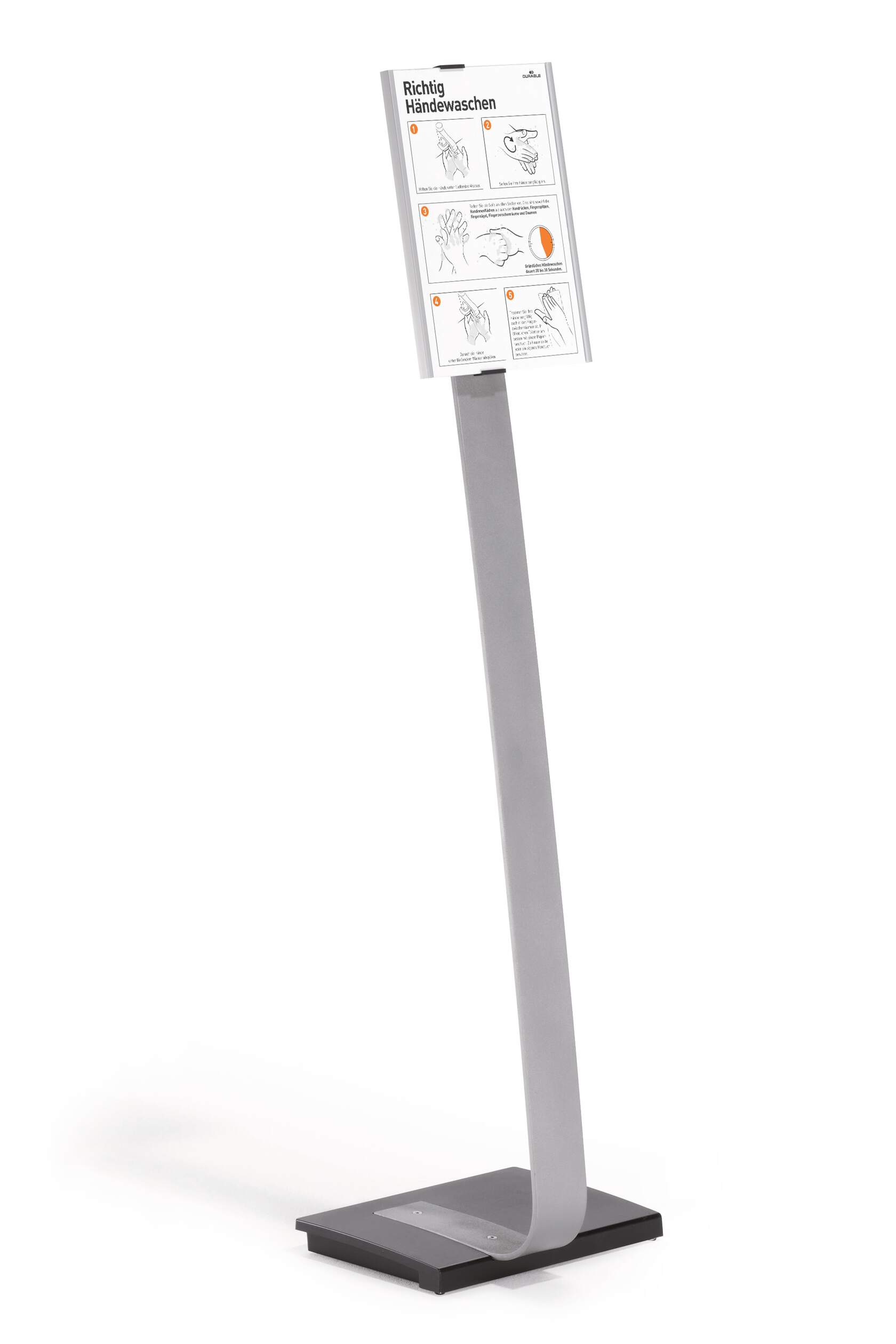 Golvskyltar informerar och orienterar besökare och passar utmärkt för placering i entreer, restauranger, utställningar m fl ställen. Skyltserien INFO SIGN har en baksida och kantlister av aluminium. Det vita arket med text sitter skyddat bakom den reflexfria frontskivan som skjuts ner i kantlisterna och hålls på plats av två svarta fästen. Golvstället består av en tung och stadig fot , ett stativ av aluminium och den vridbara skylten för material i A4 liggande eller stående format. Skylten kan placeras på 6 olika höjder och ställets höjd med stående skylt är mellan 1.11 – 1.18 m. Med liggande skylt är höjden 1.06 – 1.13 m. Levereras med monteringsanvisning.