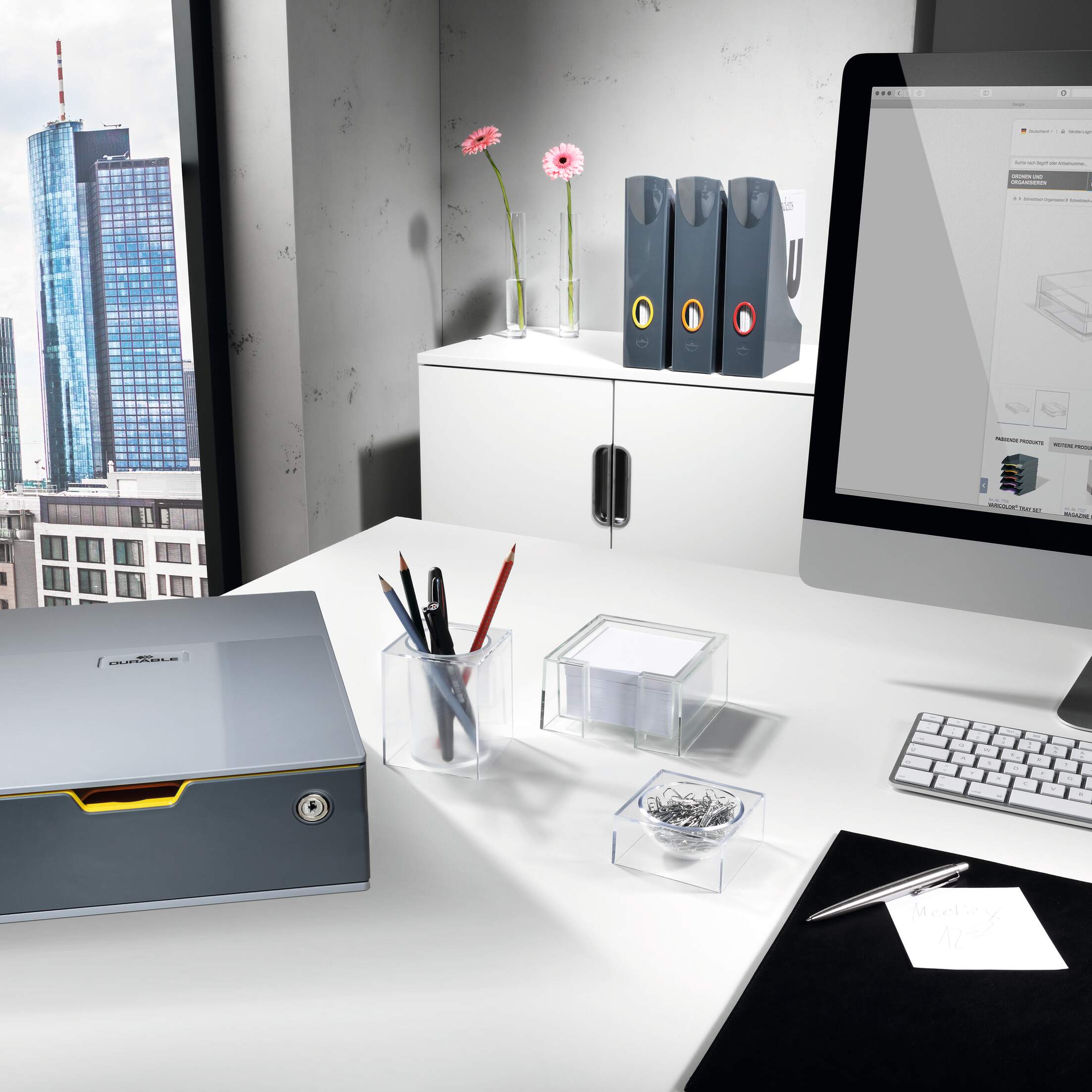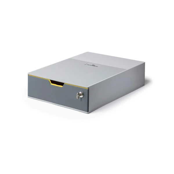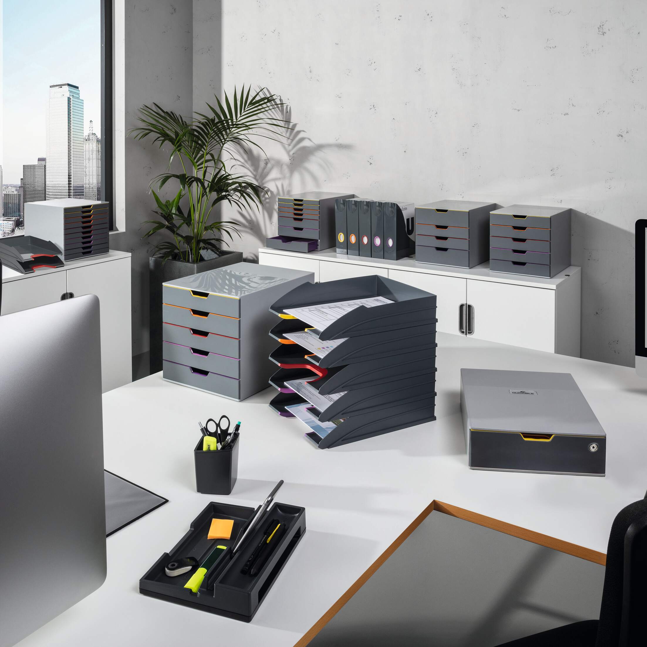 Förvaringsbox, blankettbox, arkivbox, lådbox, minibyrå – oavsett vad man kallar den är VARICOLOR® 1 SAFE en klassisk låsbar allroundbox i modern design för förvaring och organisering av papper och övriga prylar. Kan stå framme på skrivbord, bänkar och hyllor eller användas i kontorsskåp. Boxen har en lättglidande och tystgående låda med utdragsstopp. Rymmer dokument upp till C4 storlek. Går att stapla ovanpå varandra. Glidsäkra plastfötter gör att boxen står stadigt och inte repar ytan den står på. Lådan, som har en innerhöjd på 7,5 cm, går att låsa med ett cylinderlås som det följer med två nycklar till. Perfekt för personliga tillhörigheter eller mer känsliga dokument som inte vem som helst ska komma åt. 5 års garanti. Mått: 280 x 95 x 356 mm (B x H x D)