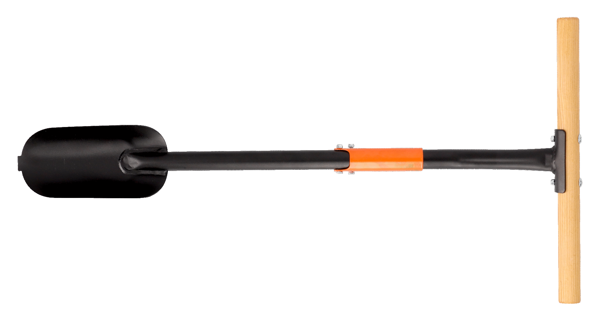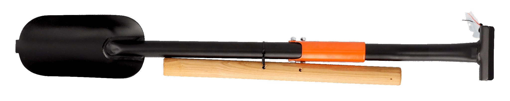 Planteringsborr för barrotsplantor. Härdat stålblad. Vinklat stålrörsskaft. Spets på bladet för enklare grävning. Handtag som underlättar lyftning. Handtaget kan fällas in. Handtag i trä. Från Bahco.