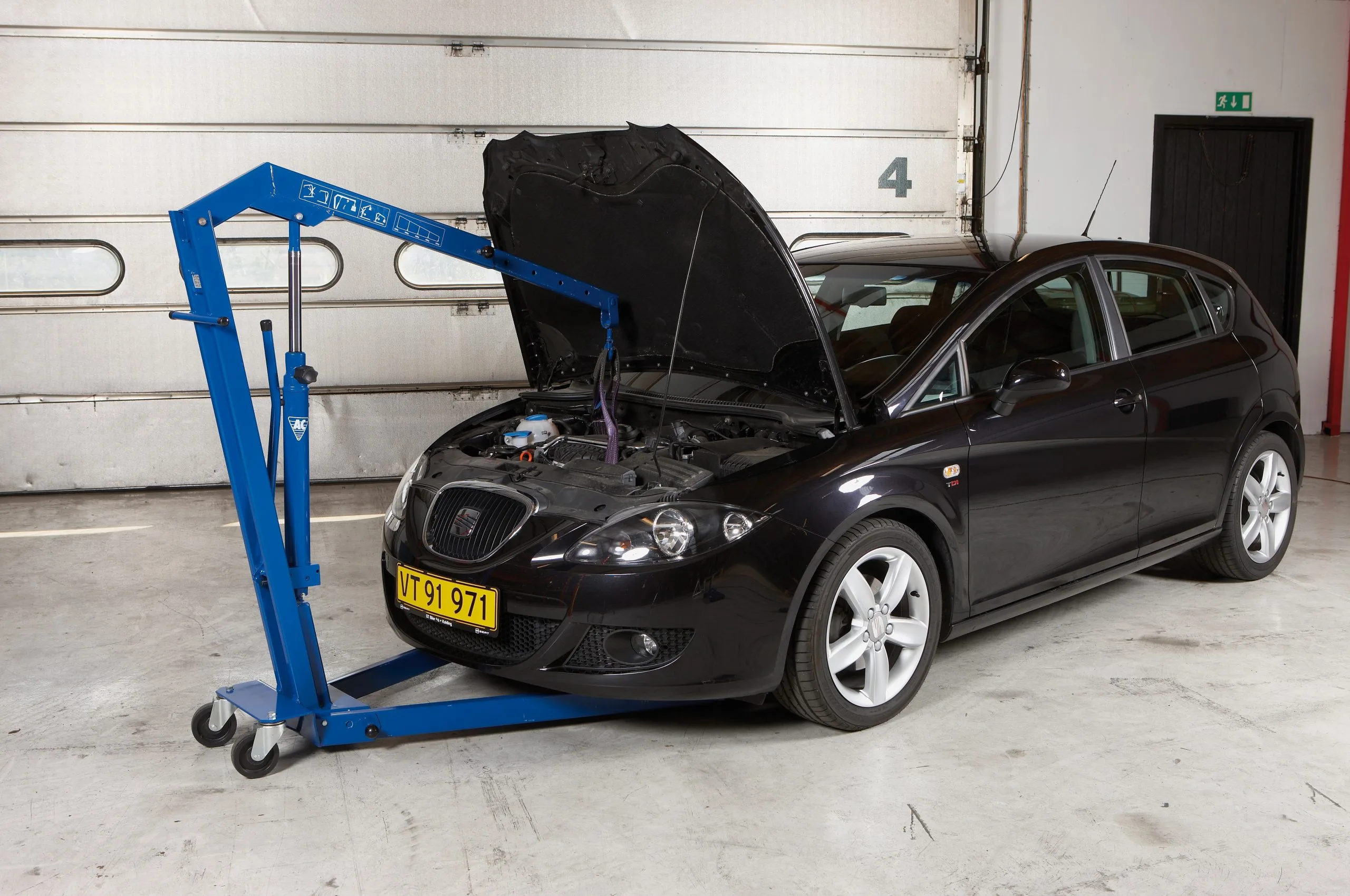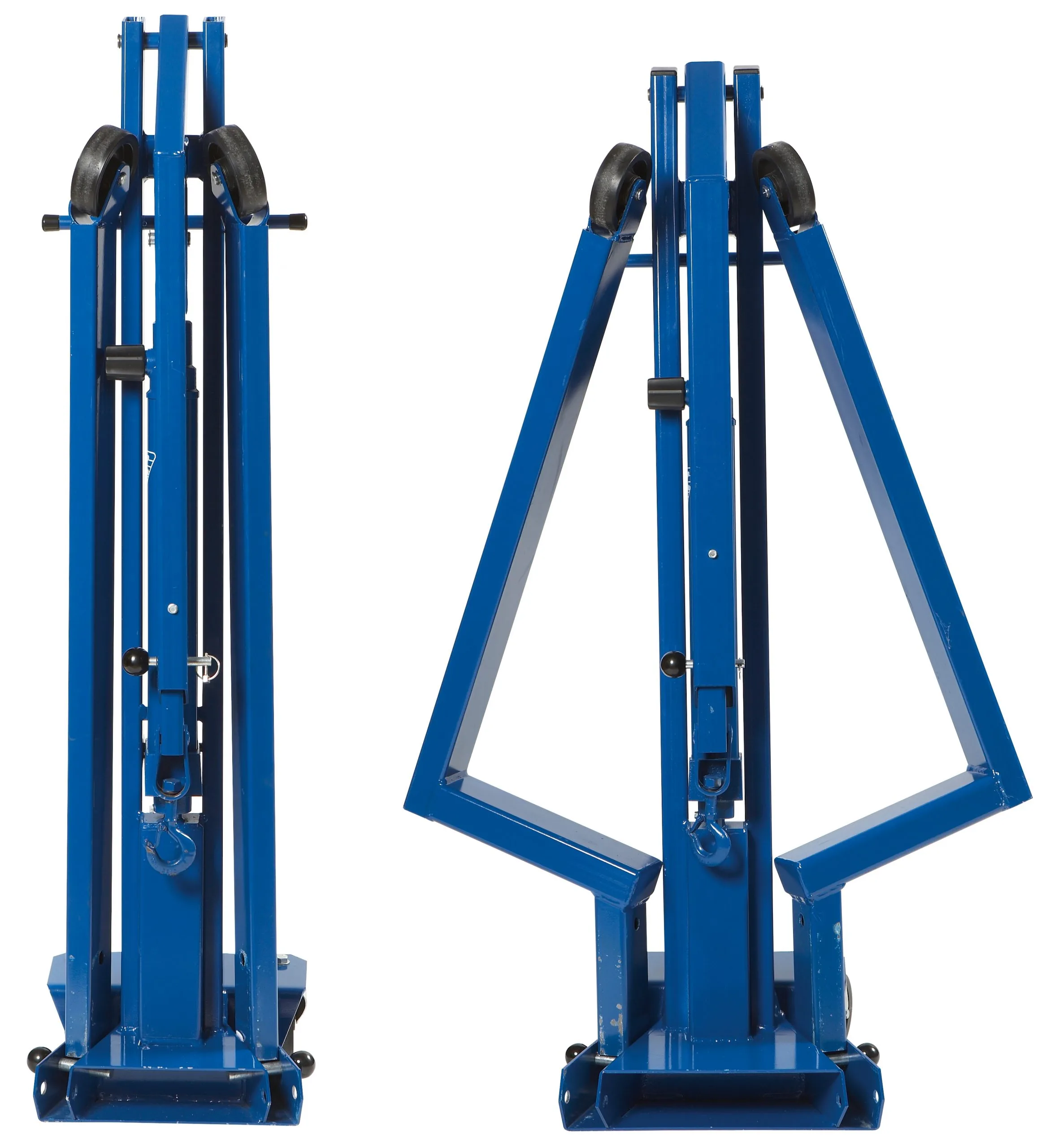 Hydraulisk verkstadskran för bilverkstäder och servicefordon. Kan fällas ihop på några få sekunder för snabb och enkel förvaring. Hopfälld kräver kranen minimalt med plats på verkstadsgolvet. Utdragsarm med stor lyftkapacitet, även i det yttersta läget. (*Se kapacitetsöversikt). Hårdförkromad kolvstång och pumpkolv säkrar lång livstid. Inbyggd säkerhetsventil skyddar mot överbelastning. 360° svängbara bakhjul säkerställer att kranen är manöverduglig även med full belastning. Utrustad med 360° vridbar krok. Handmanövrerat dödmansgrepp ger optimal säkerhet vid sänkning.