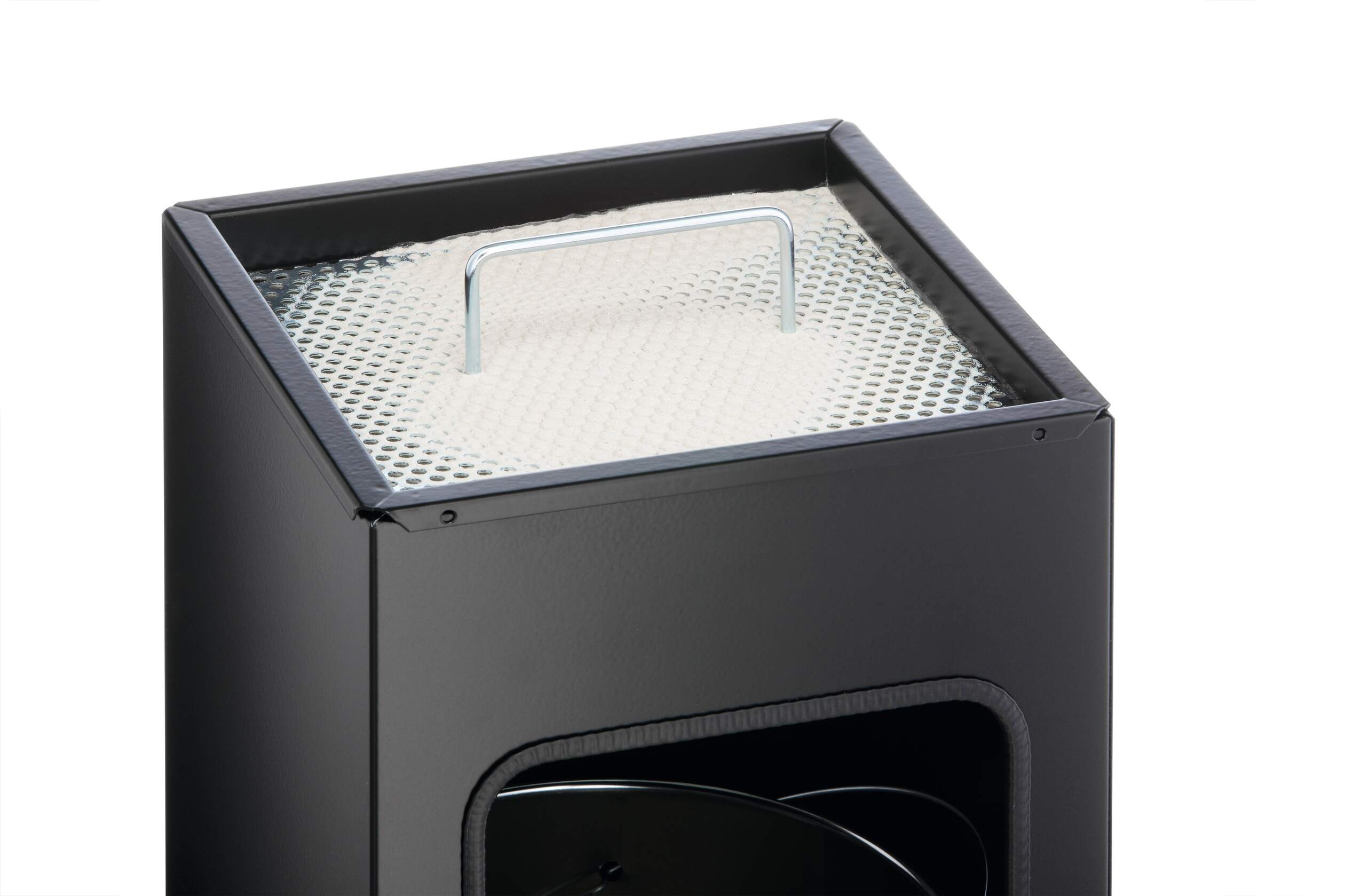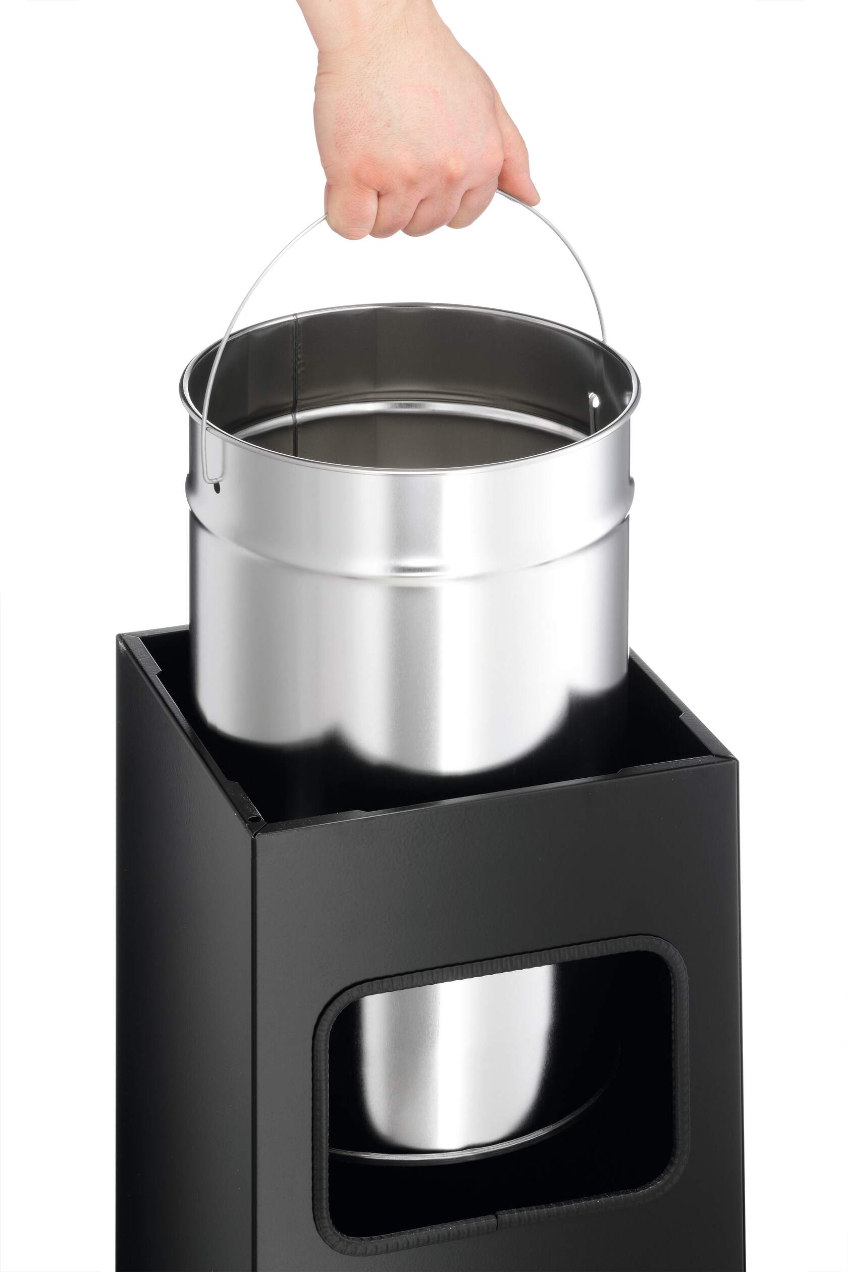 Praktiskt 2-i-1 lösning – kombinerad papperskorg med askfat. 17 liters papperskorg av rostfritt stål med borttagbar innerhink med handtag som gör den lätt att tömma och rengöra. Borttagbar askkopp av aluminium som fylls med sand och har en gallerinsats som kan lyftas bort från sanden när askkoppen ska tömmas från fimpar. 1,5 kg sand medföljer. Inkastöppning från två håll. Antiglidskydd på undersidan.