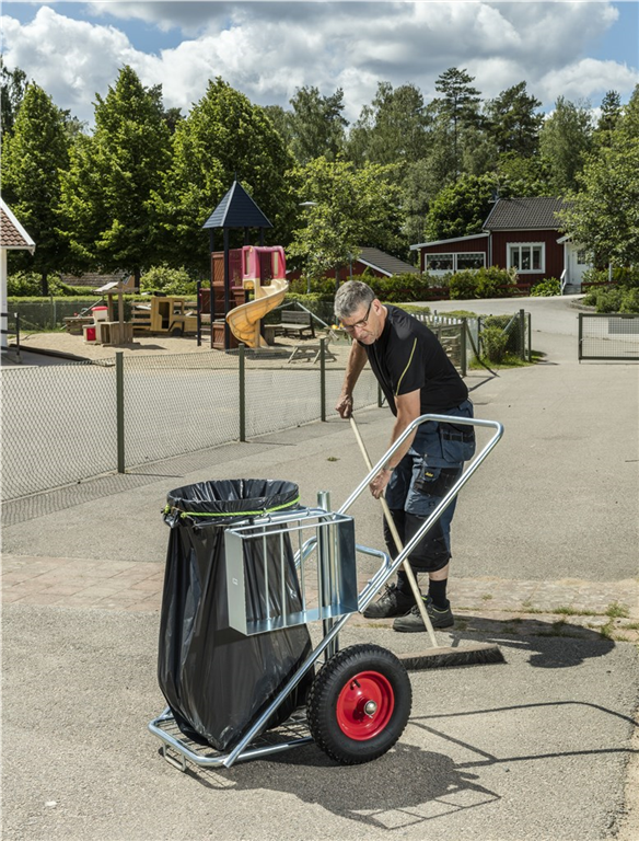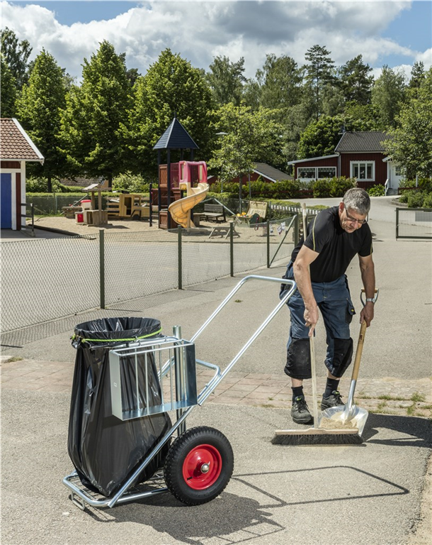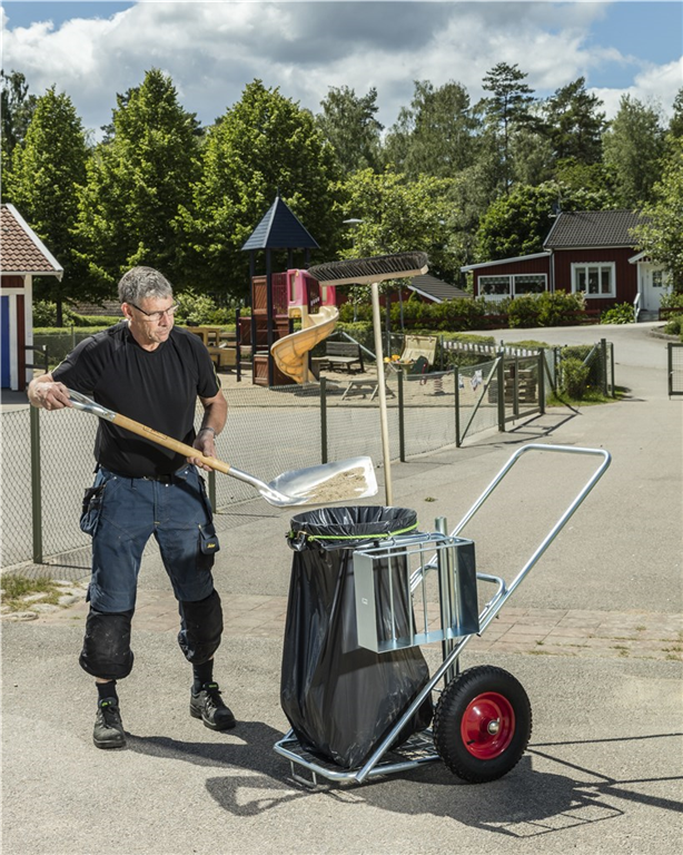 Städkärra för utomhusbruk. Gummistropp som håller säcken på plats. Avsedda hållare för skyffel och borste, samt ett fack för diverse prylar. Kraftiga 400mm luftgummihjul.