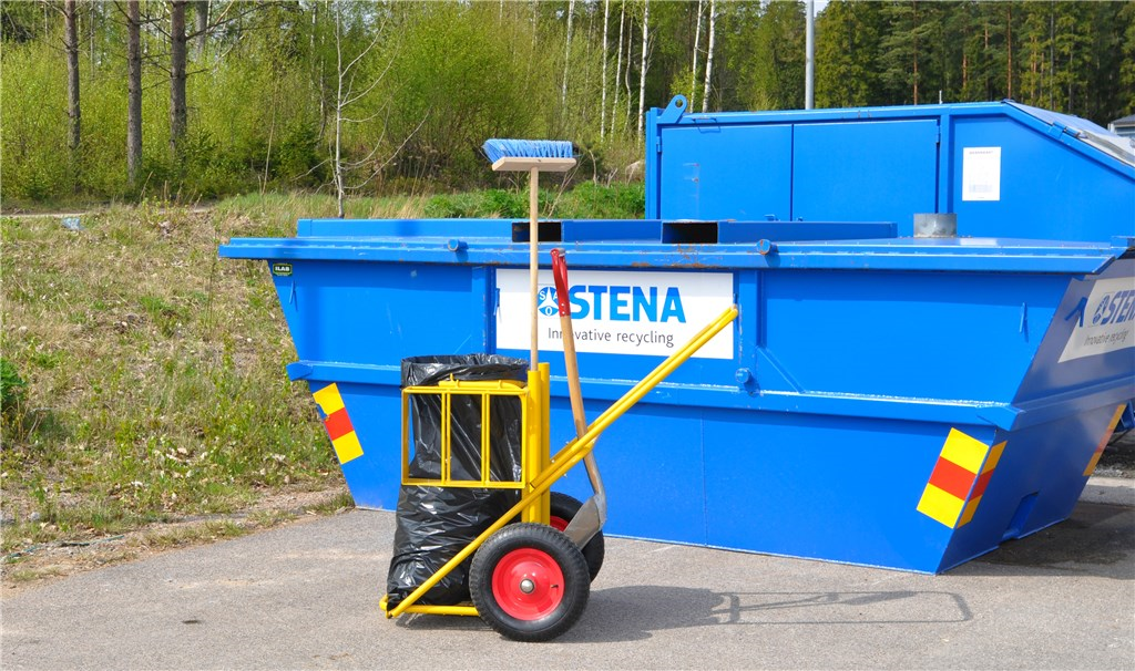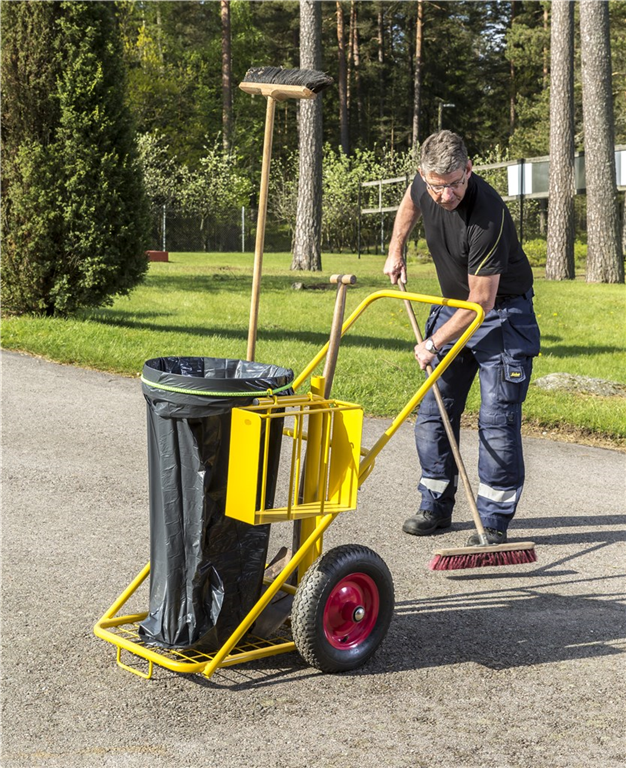 Städkärra för utomhusbruk. Gummistropp som håller säcken på plats. Avsedda hållare för skyffel och borste, samt ett fack för diverse prylar. Kraftiga 400mm luftgummihjul.